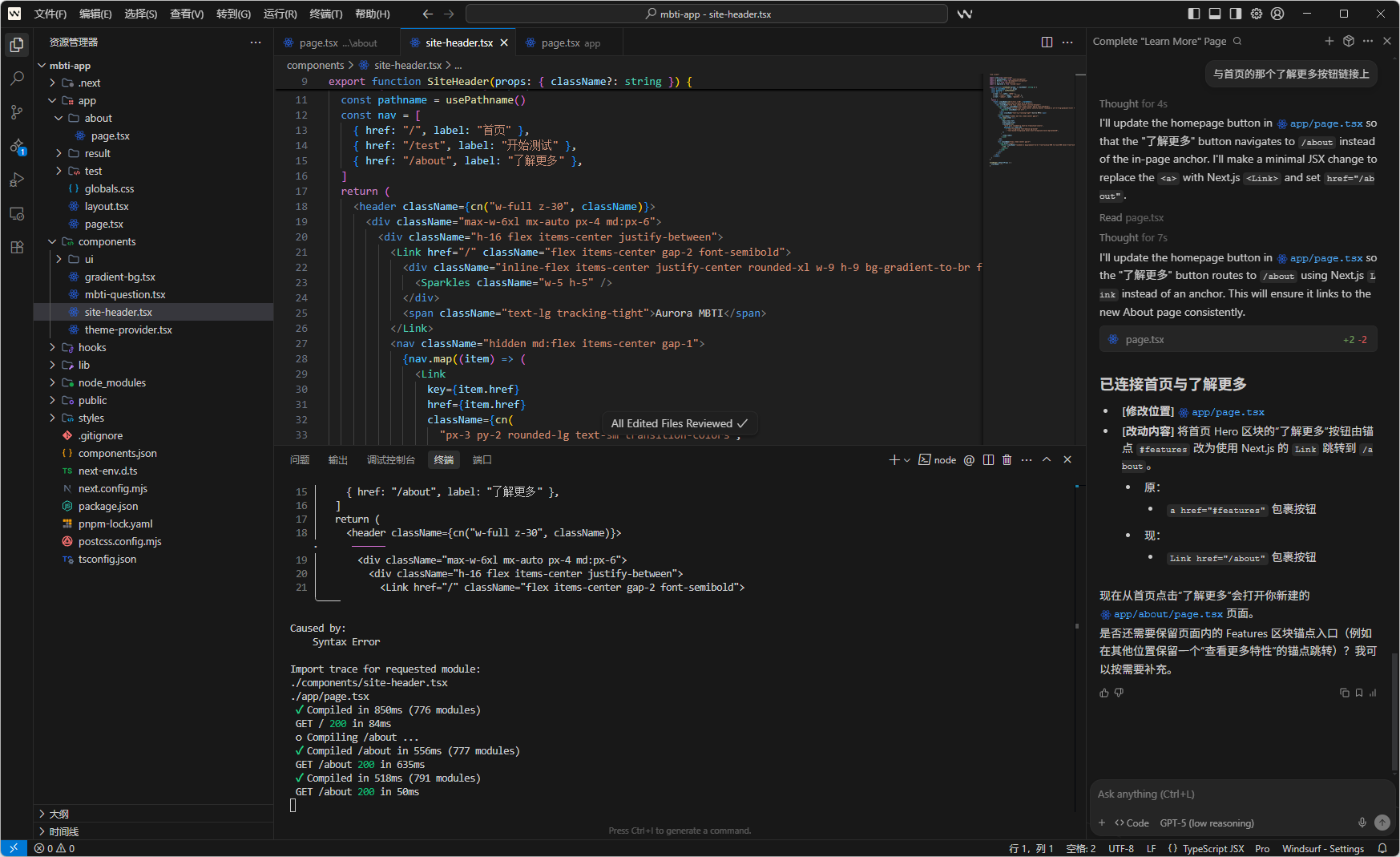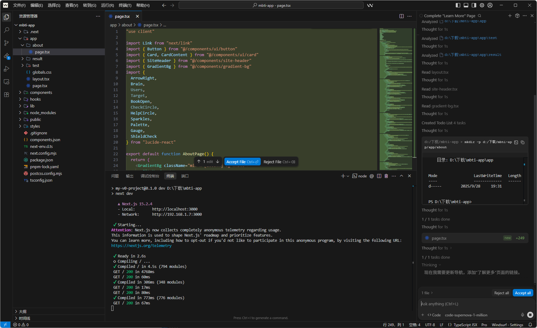 接着我们就可以使用ai帮助我们在网站中增加更多功能了,例如我想让ai吧那个 了解更多 页面做出来,稍后AI会自动读取项目中的文件,然后自行编辑文件,AI有的时候会需要你同意它执行命令