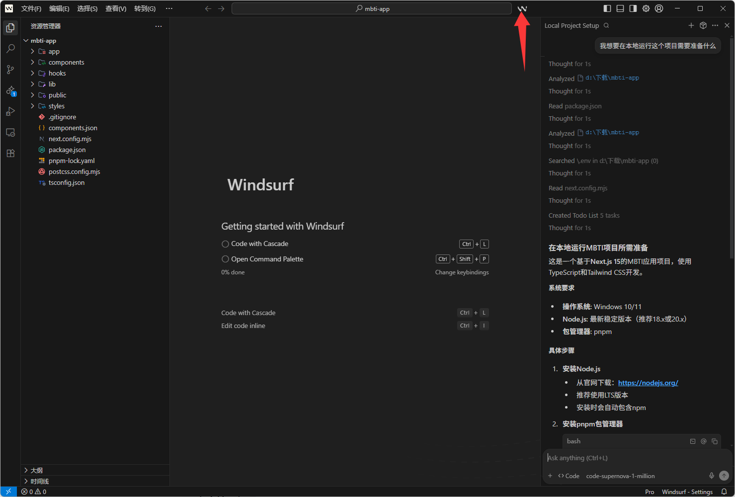 接着我们需要在本地跑起来这个ai写的项目,但是不会这么?那当然是请教AI啦,点击这个图标然后与AI对话