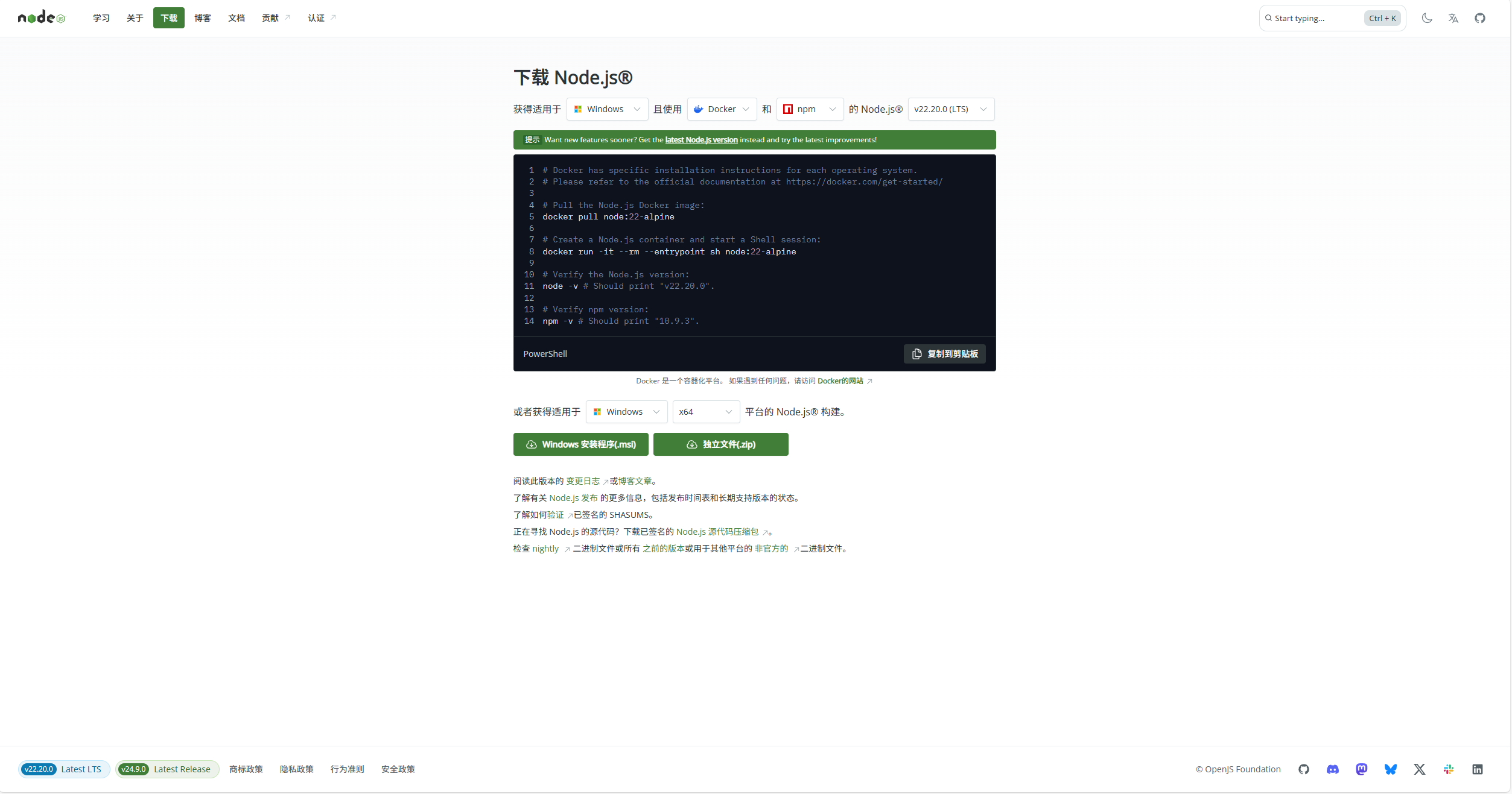 可以看到ai让我们去下载node,接下来来到node官网下载node
