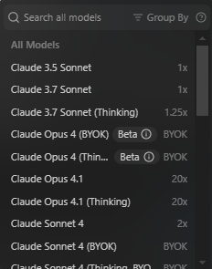 插个小话题,我建议使用这些模型:Claude Sonnet 4 ThinKing,GPT-5(medium),GPT-5-Codex,这些模型后面的x1 x2的意思是消耗的积分是多少倍,Free就是免费的意思,BYOK的意思是你要自己提供Key(这个可以不管,你也可以理解为后缀带BYOK的无法使用),这里我就用免费的模型作为示例,你们在自己用的时候最好是用我推荐的,不然有的时候你可能要盯着模型改一个晚上的bug都可能改不好
