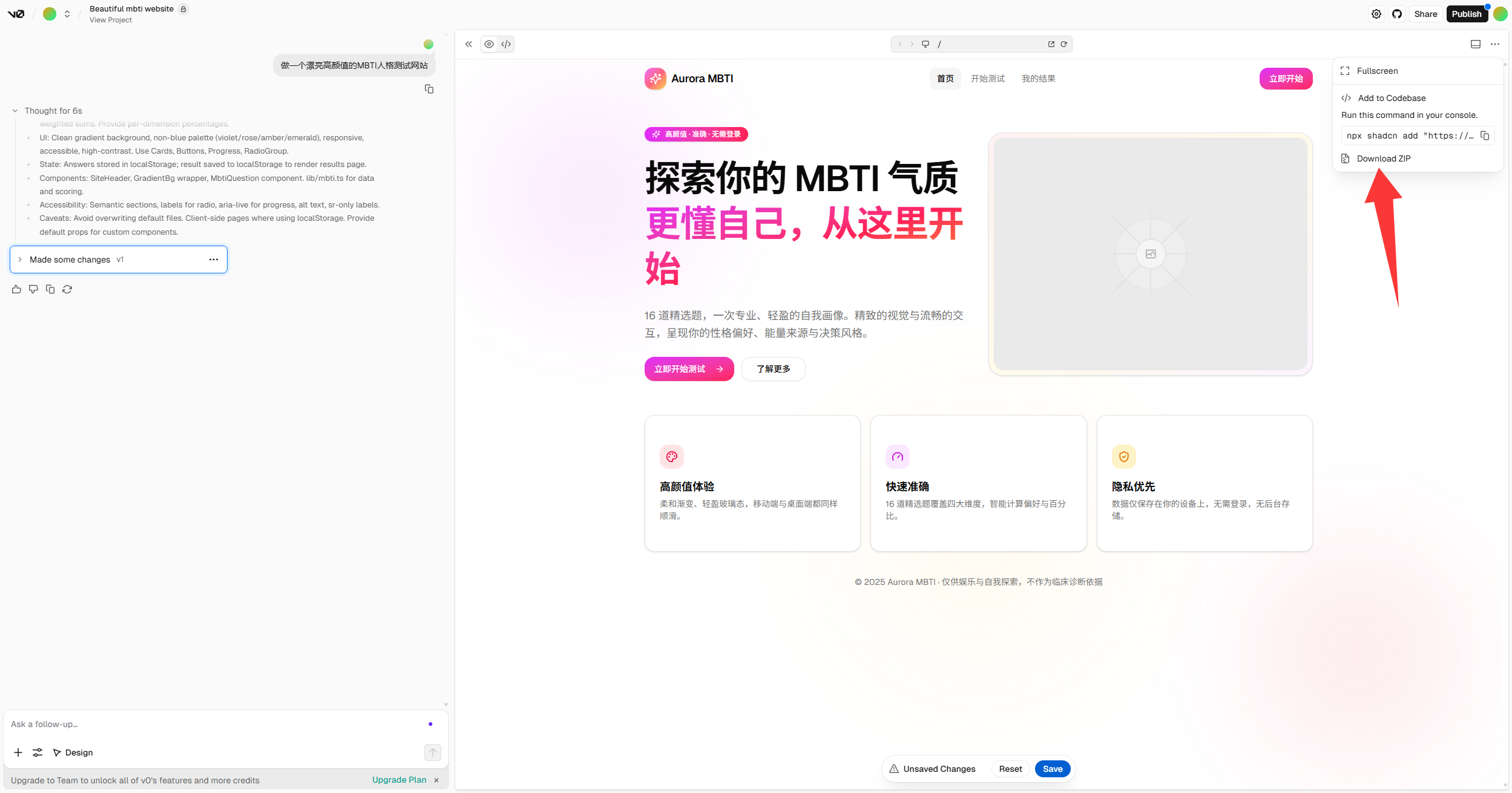 接下来我们把刚刚在V0做好的,下载ZIP压缩包