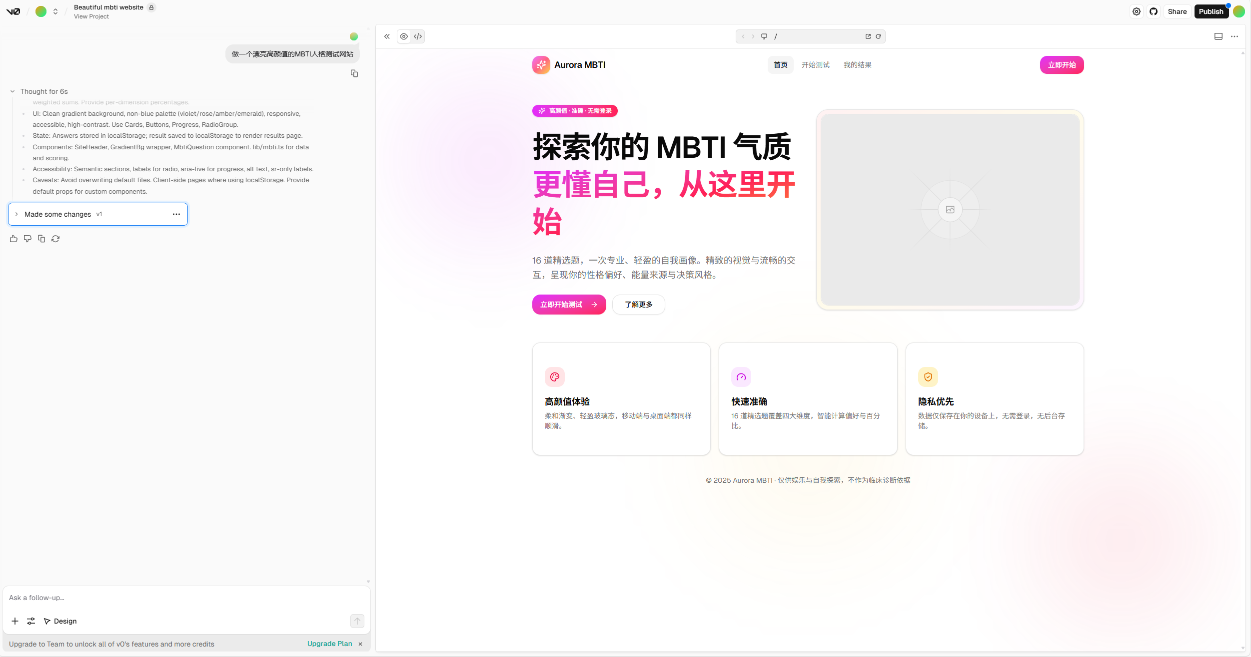 打开 v0 by Vercel (v0.dev),免费用户每月可获得 5 美元的额度。 在这里,你可以向 AI 描述您的设计需求,AI 将自动进行设计并呈现最终结果。以我的网站为例,可以看到其完成度相当不错。