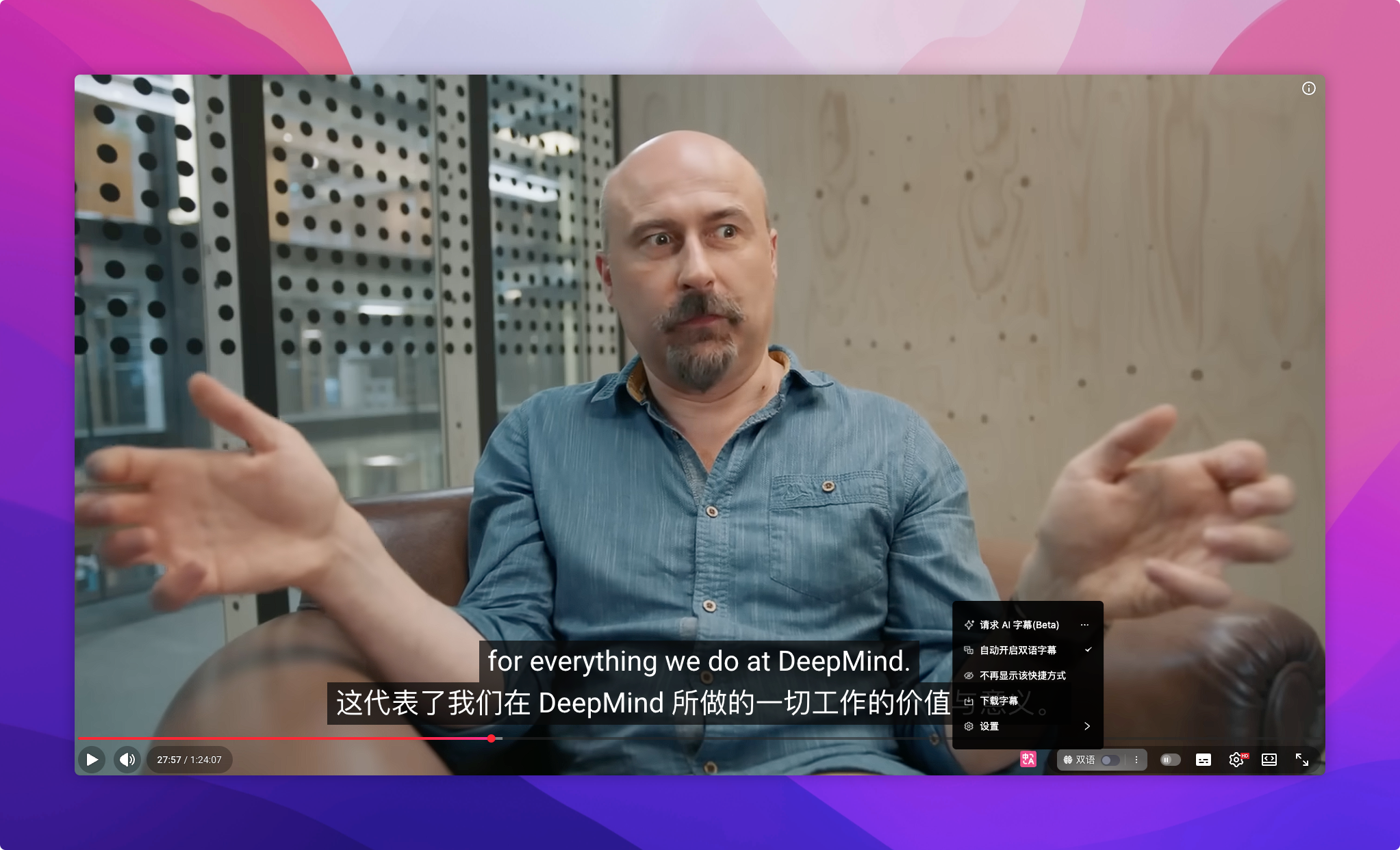 观看 YouTube 视频时,经常遇到缺少简体中文字幕的情况。沉浸式翻译很好地解决了这个问题,只需打开自动开启双语字幕,就能获得以下效果: