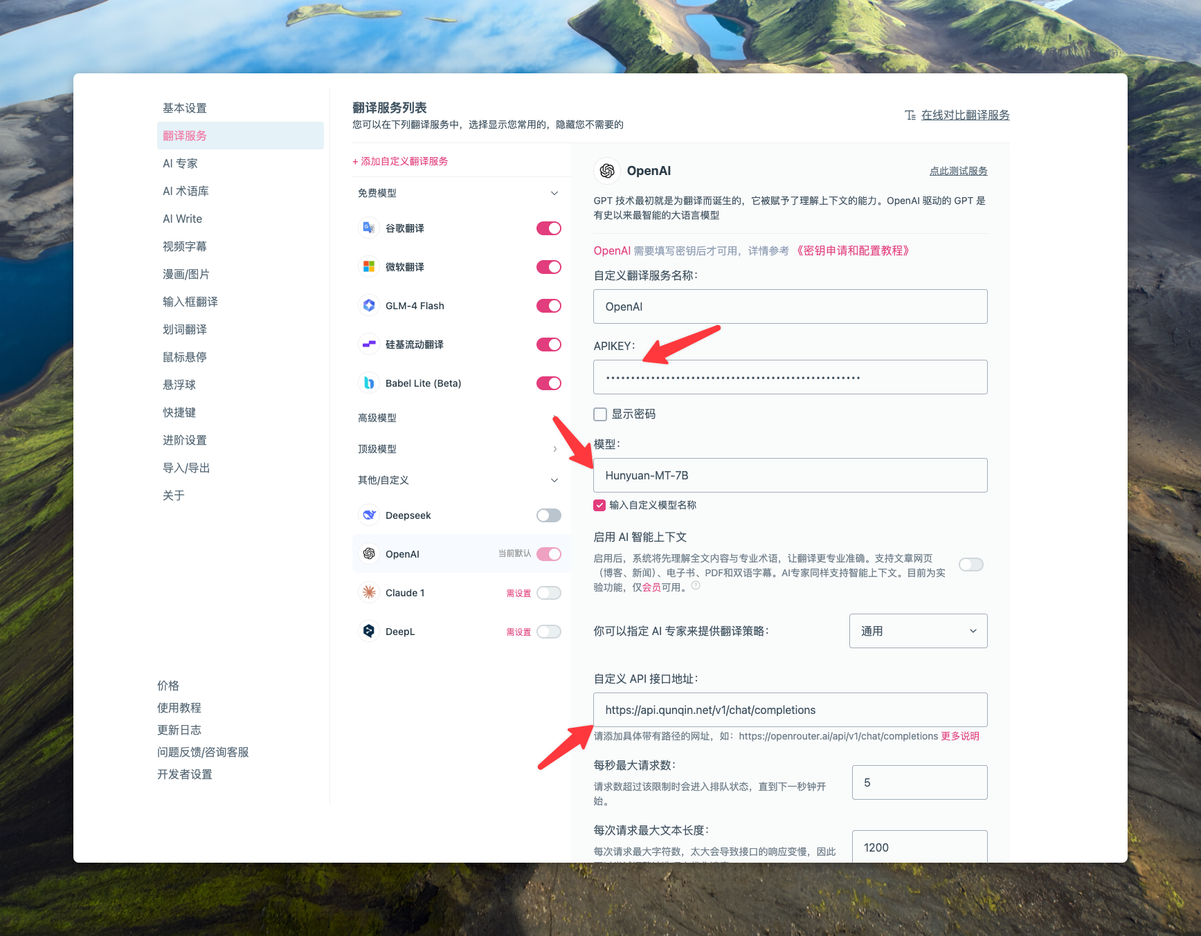 然后来到翻译设置,填写 Key 和使用模型,以及 API 调用地址。